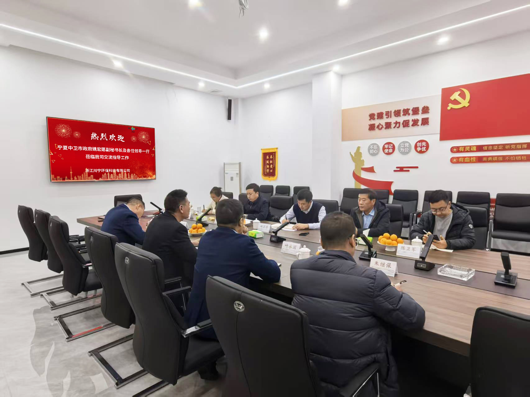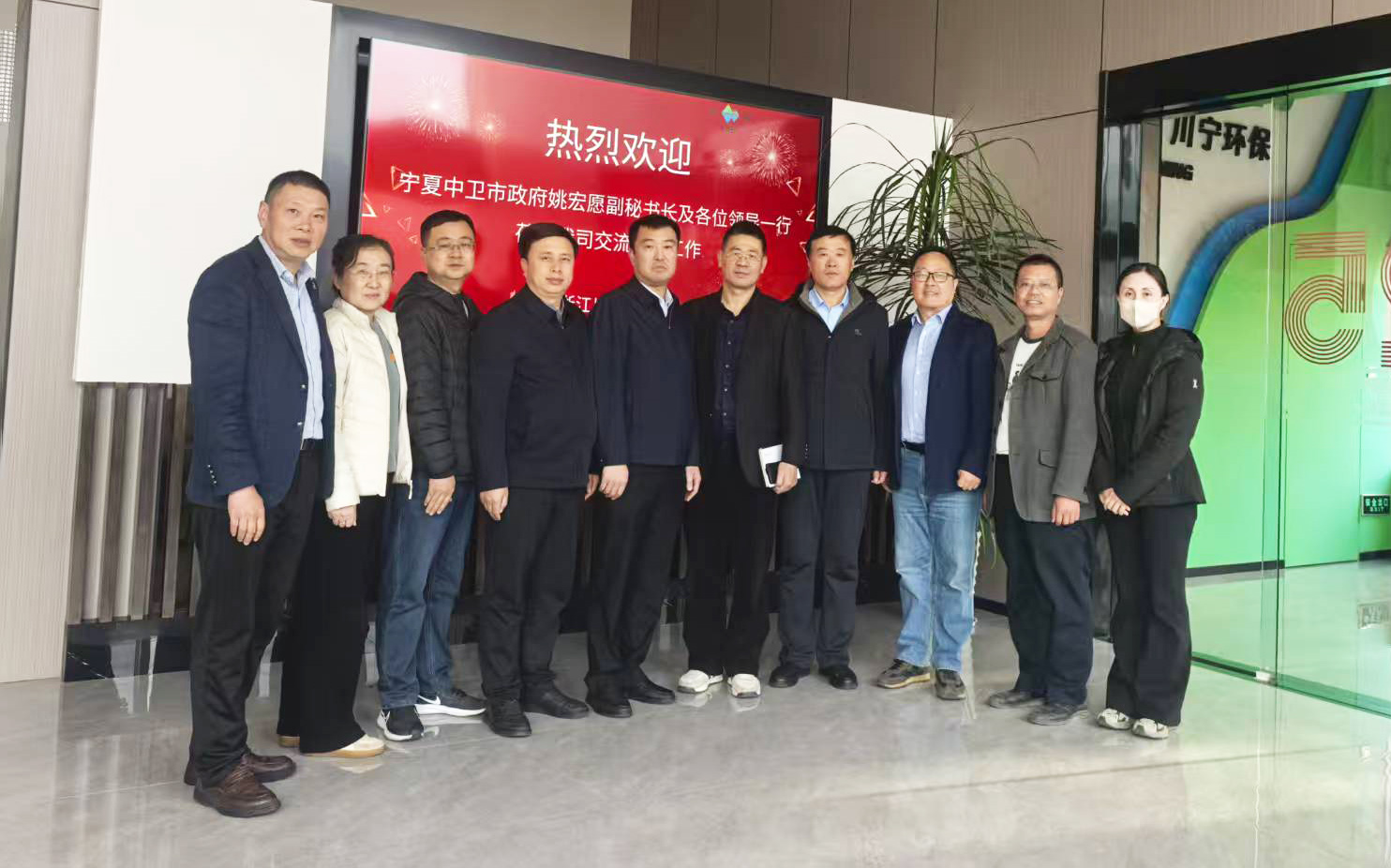 2025年12月10日,由寧夏中衛(wèi)市政府副秘書長姚宏愿帶隊,工業(yè)園區(qū)黨工委委員李廣強,市生態(tài)環(huán)境局副局長李玉明,市財政局調(diào)研員李衍萍,工業(yè)園區(qū)管委會財政金融局局長陳衛(wèi)軍,工業(yè)園區(qū)管委會綜合服務(wù)局干部馬紅霞等組成的政府考察團,專程蒞臨我司進行考察調(diào)研。此行旨在深入了解我司在環(huán)??萍碱I(lǐng)域的創(chuàng)新成果與運營模式,共商合作大計,共繪發(fā)展藍圖。我司總經(jīng)理邵永富攜核心管理團隊熱情接待,雙方舉行了座談交流會。